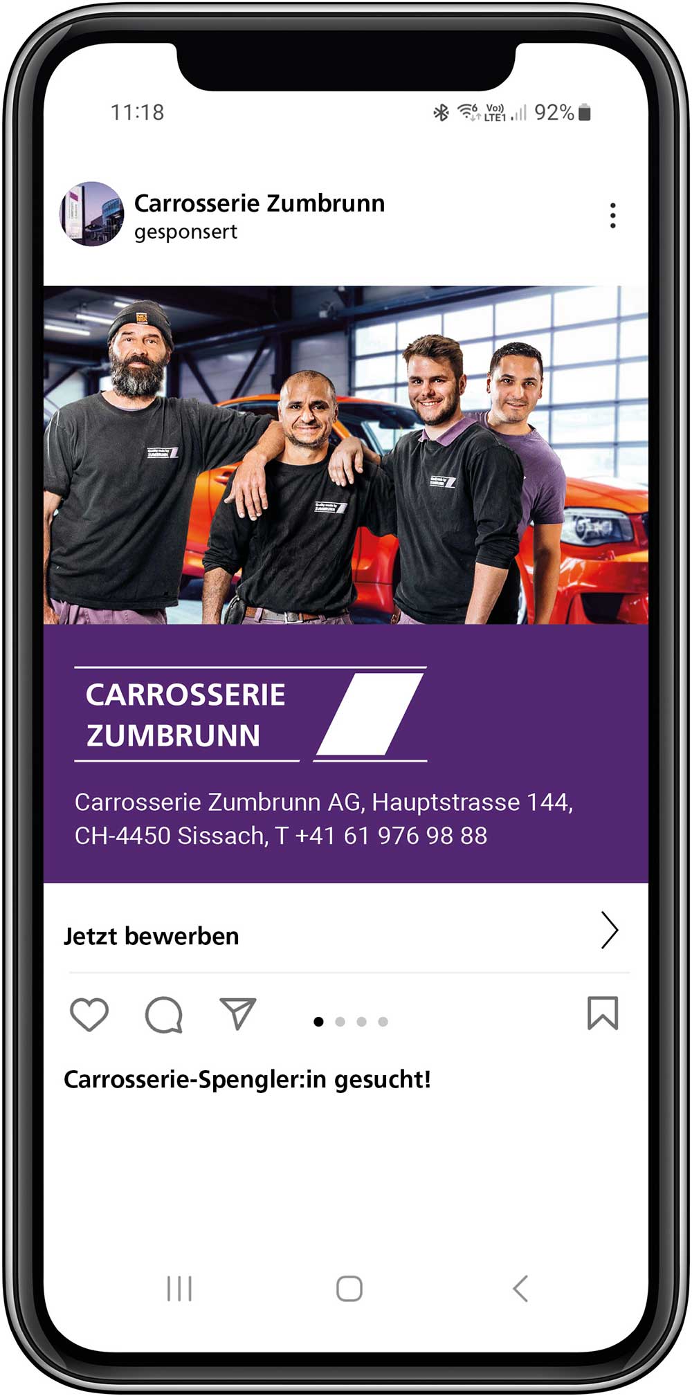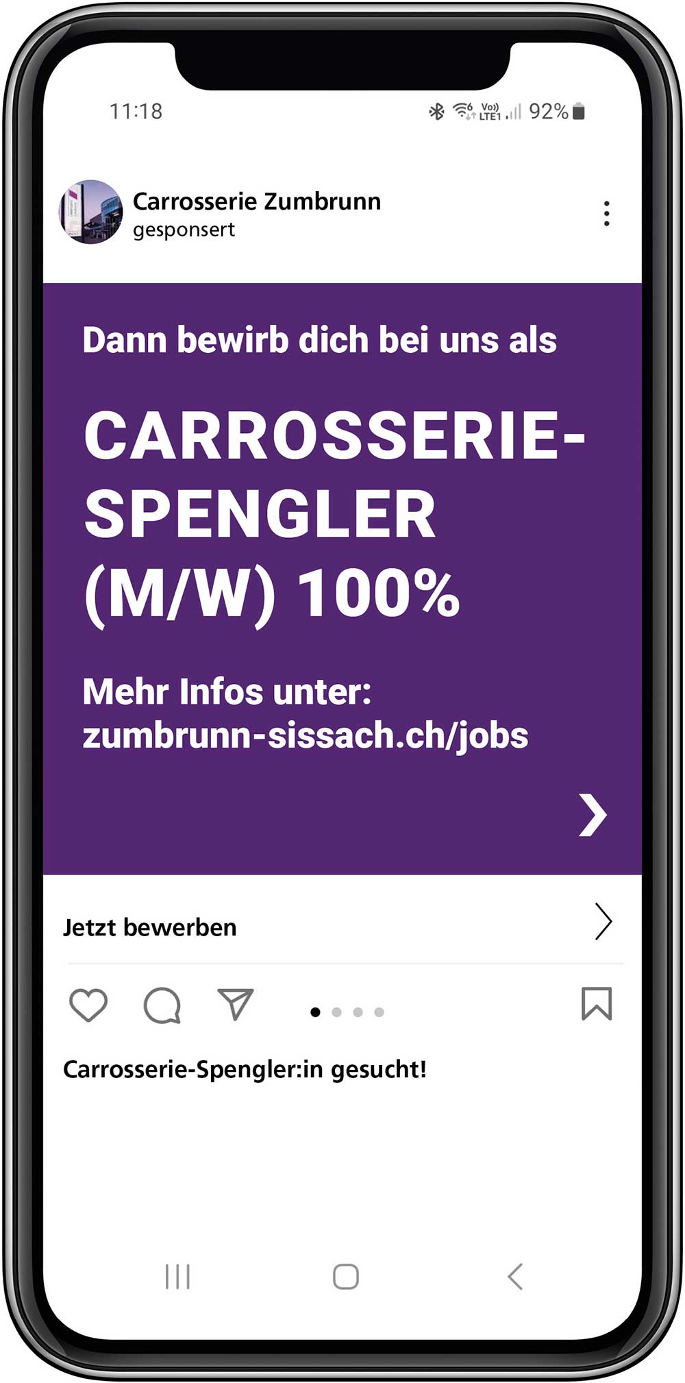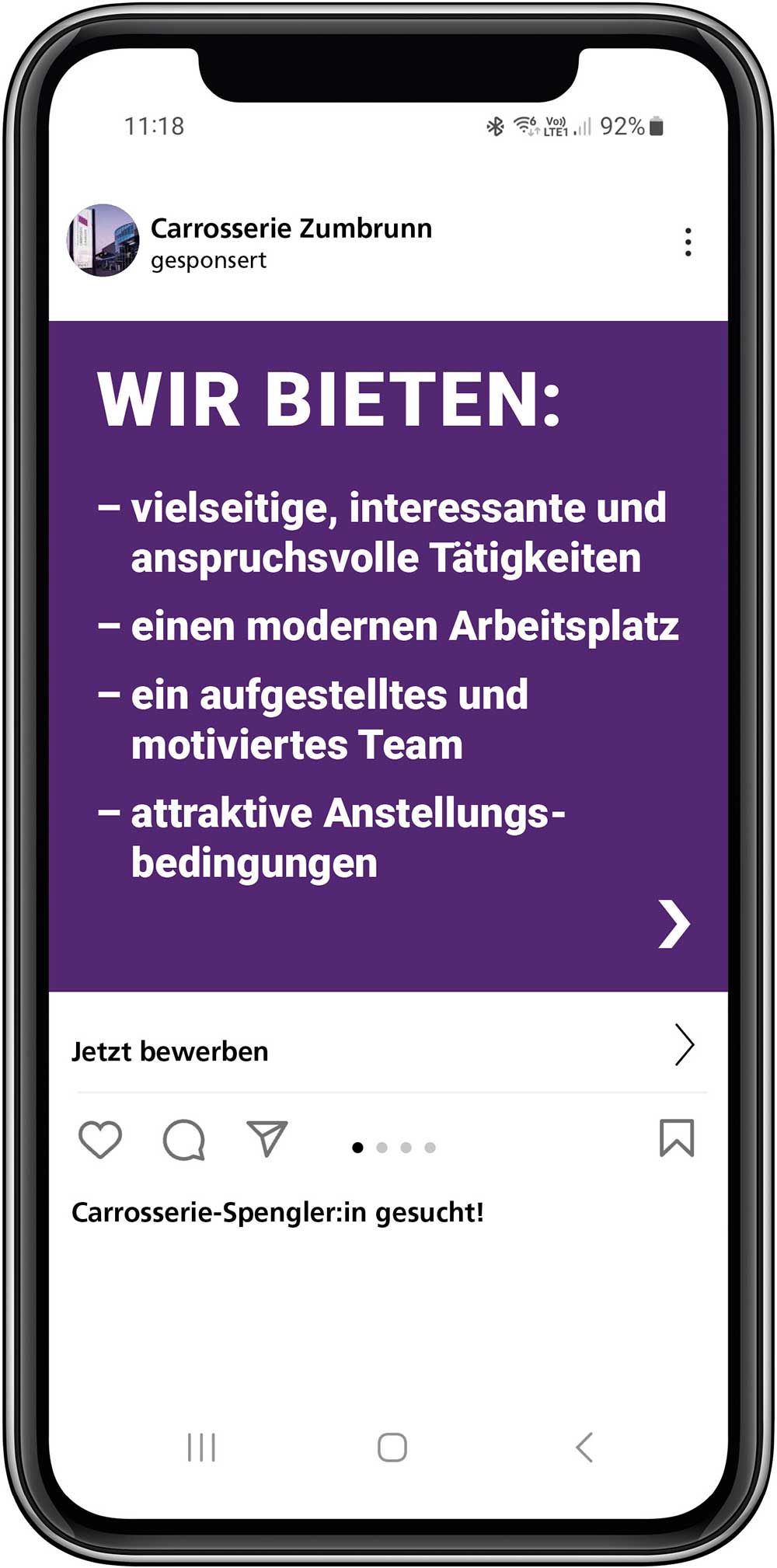 Wir verschaffen Ihnen in der Informationsflut Gehör mit bildstarken Social-Media-Marketing-Umsetzungen. Damit Sie Ihre Ziele erreichen, stehen uns erfahrene und professionelle Partner zur Seite. Wir zeigen Ihnen den Weg zum zielorientierten Online-Auftritt mit individuellen Marketing-Massnahmen, die ideal mit Ihrer Offline- Strategie gekoppelt sind. Zum Beispiel wirkungsvolle Stellenkampagnen auf Facebook, Whatsapp und Instagram.