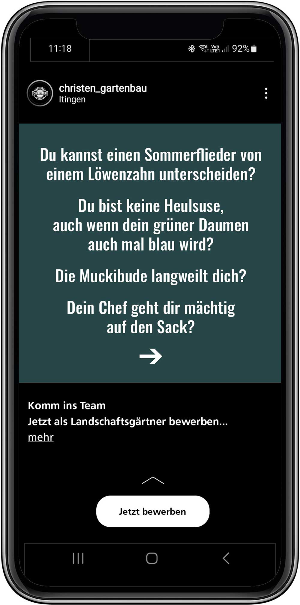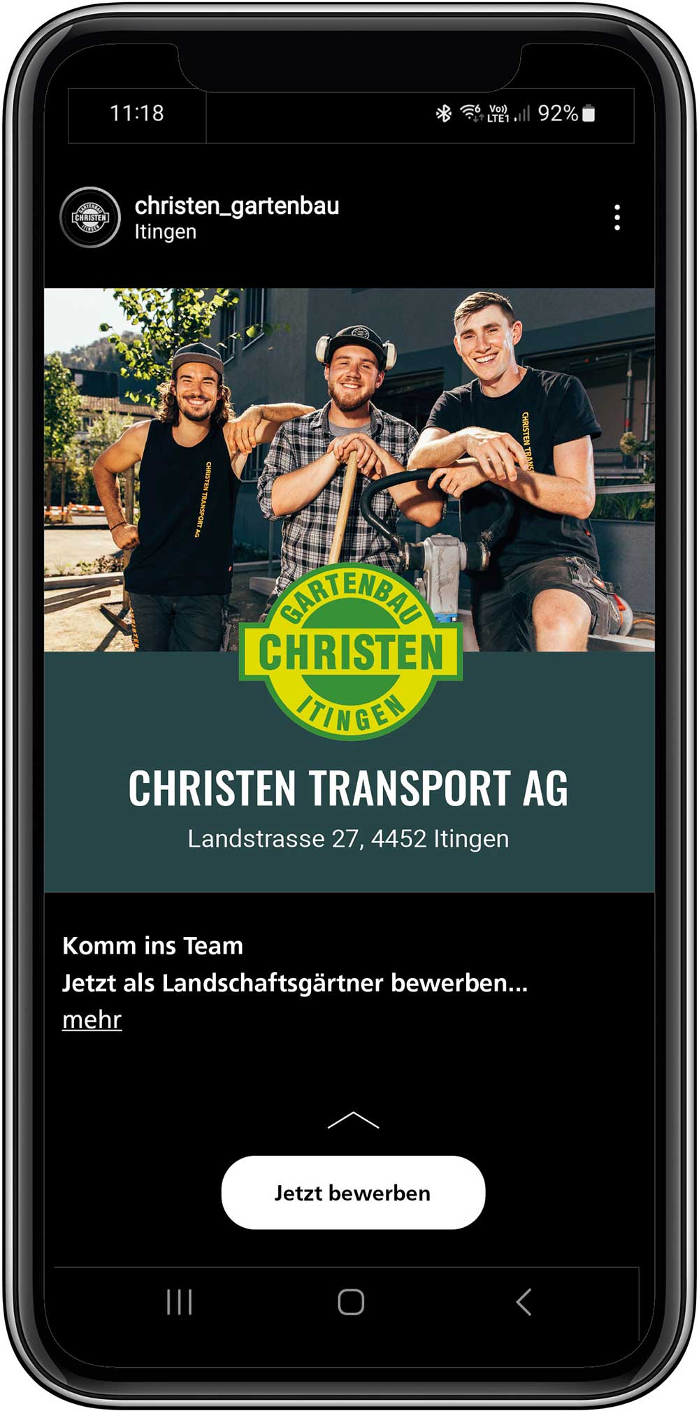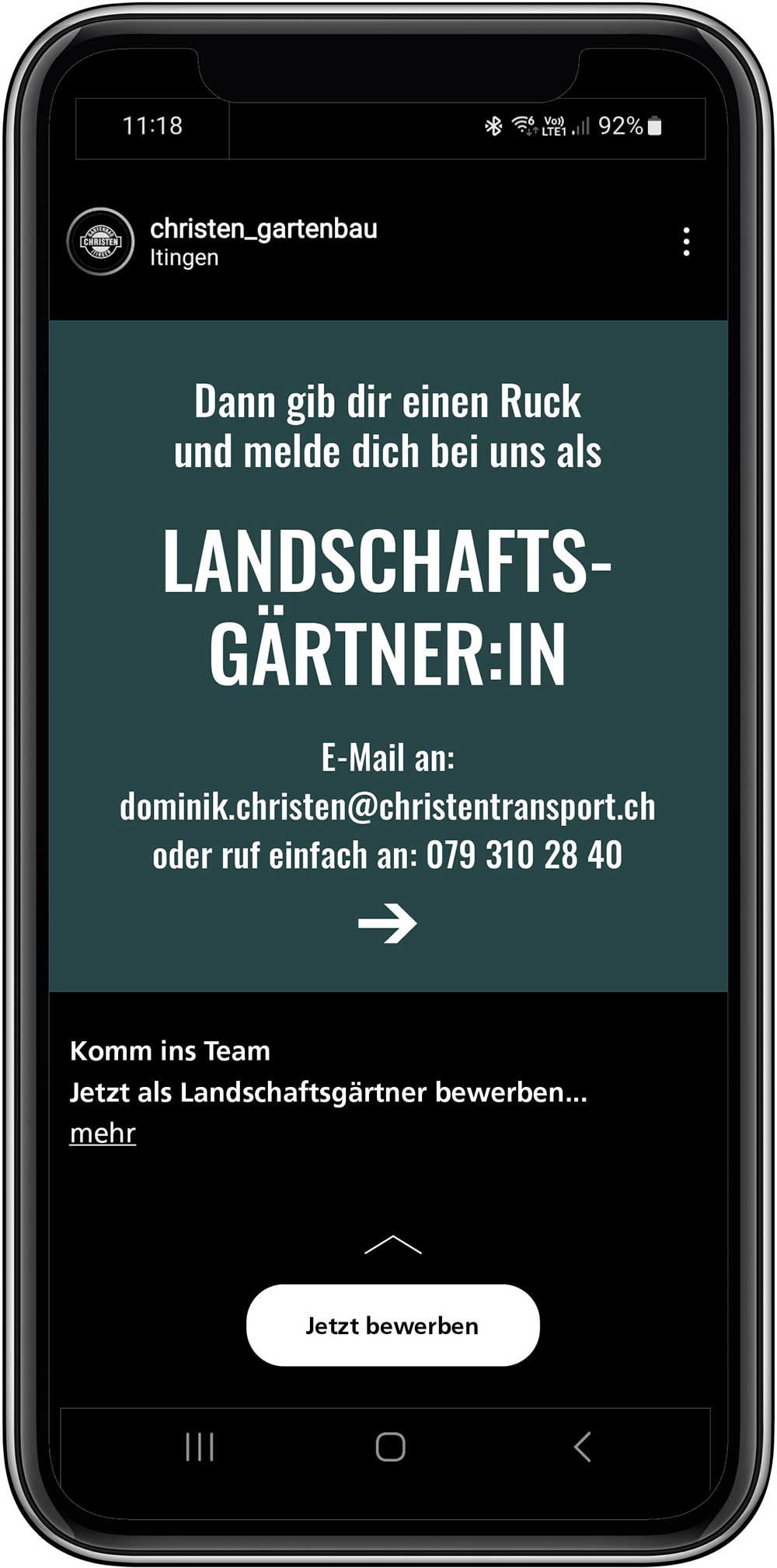 Wir verschaffen Ihnen in der Informationsflut Gehör mit bildstarken Social-Media-Marketing-Umsetzungen. Damit Sie Ihre Ziele erreichen, stehen uns erfahrene und professionelle Partner zur Seite. Wir zeigen Ihnen den Weg zum zielorientierten Online-Auftritt mit individuellen Marketing-Massnahmen, die ideal mit Ihrer Offline- Strategie gekoppelt sind. Zum Beispiel wirkungsvolle Stellenkampagnen auf Facebook, Whatsapp und Instagram.
